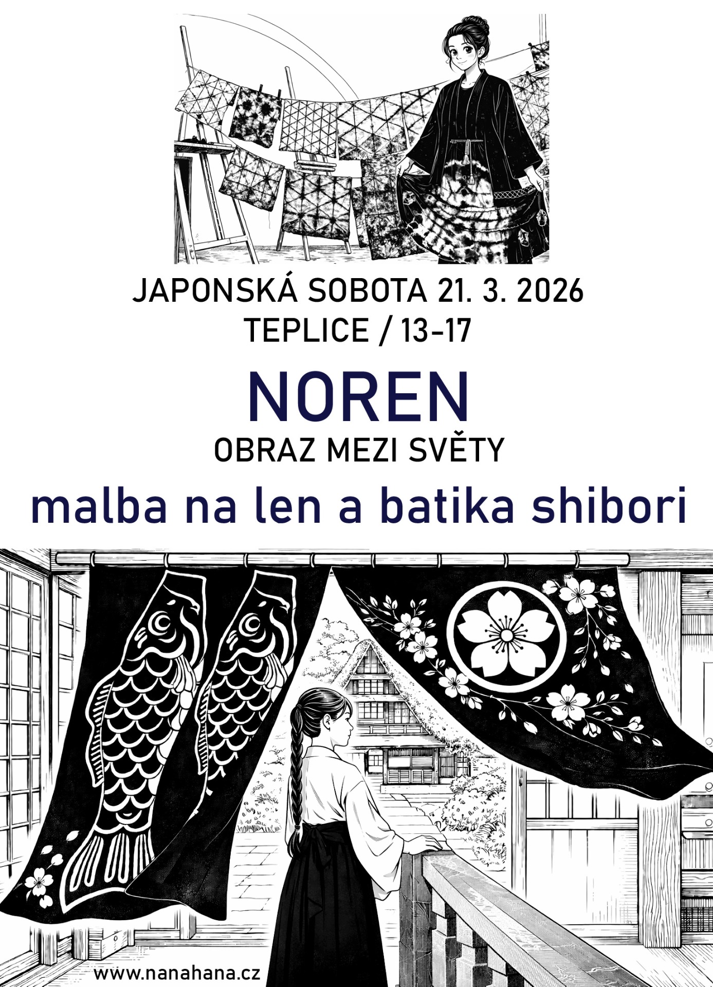 Noren (暖簾) je tradiční japonský závěs, který odděluje prostory, ale zároveň zve dál – hranice mezi vnějším a vnitřním světem. V tomto workshopu se naučíte malbu na textil, techniku skládané batiky shibori a probereme barvení v indigu ve spolupráci s Jiřím Danzingerem – mistrem modrotisku. Každý si vytvoří vlastní tapisérii nebo závěs. Motivy budou vycházet z japonských přírodních symbolů – vln, hor, bambusu či větru – elementů, které chrání domov a přinášejí štěstí.